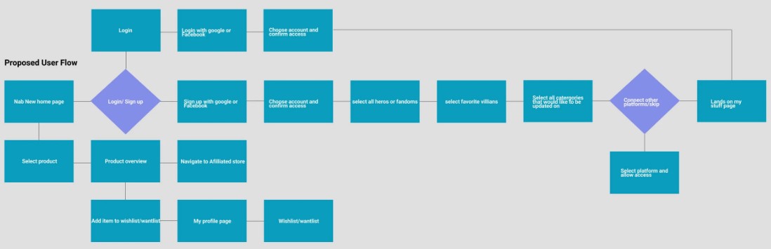 We also conducted a comparative analysis of fandom communities, social shopping sites, and collectibles release platforms. A heuristic evaluation of Nab New’s existing site revealed that it primarily redirects users to external stores and fails to follow UX best practices.