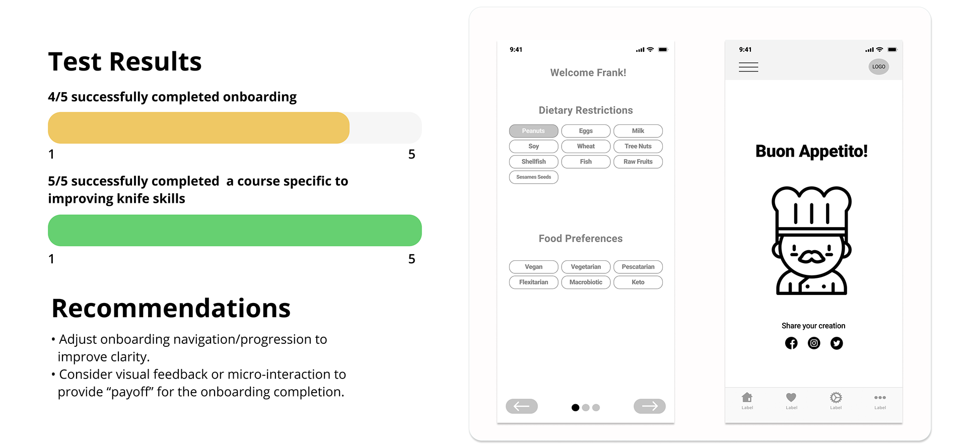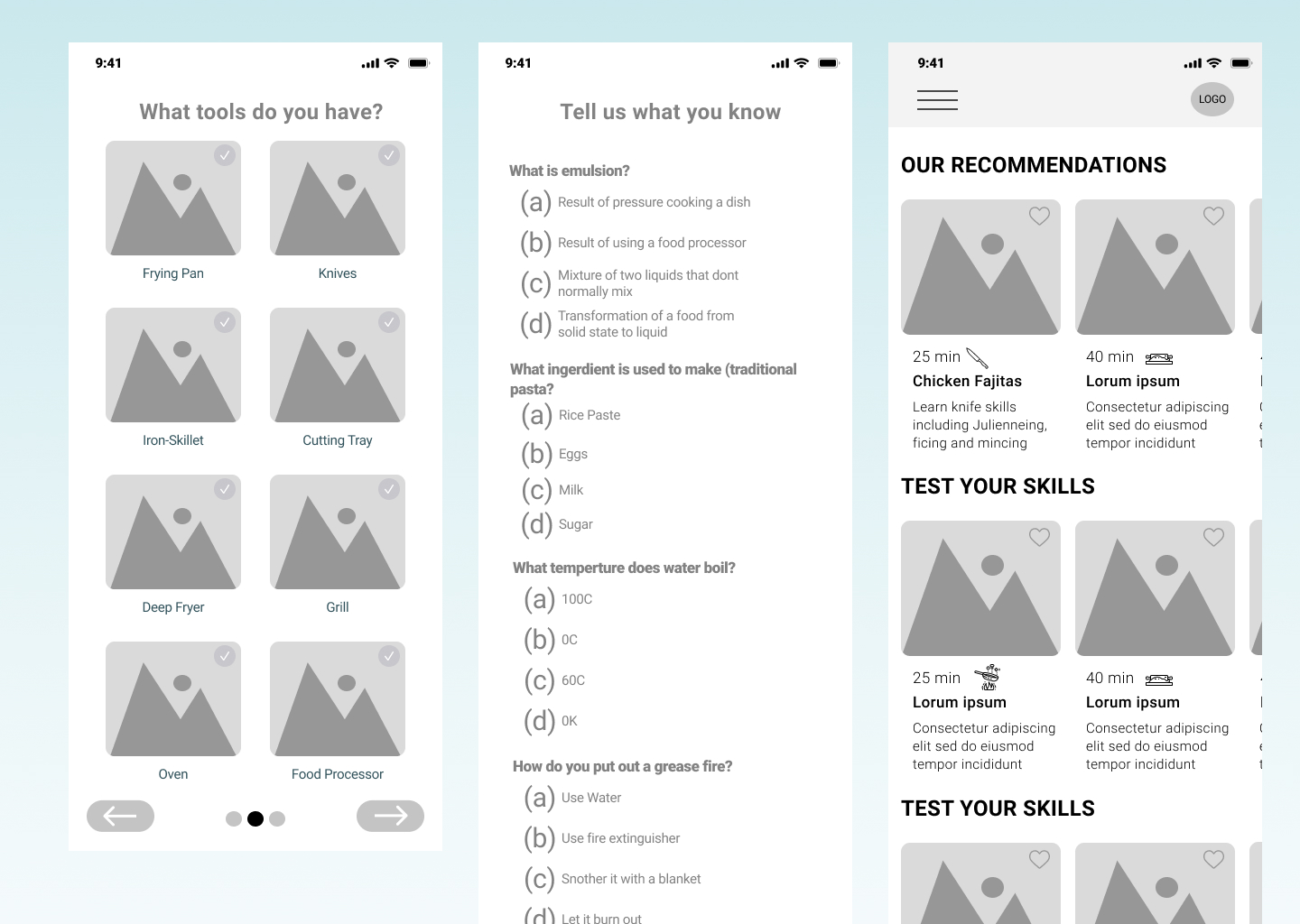 For our mid-fidelity prototype, we designed several layout options for the onboarding experience. Keeping Frank’s needs at the center, we focused on creating a seamless, personalized flow that captured his cooking tools, preferences, and goals. We then conducted usability testing to identify any points of confusion, friction, or structural issues within the wireframe, ensuring the onboarding felt intuitive and supportive from the start.