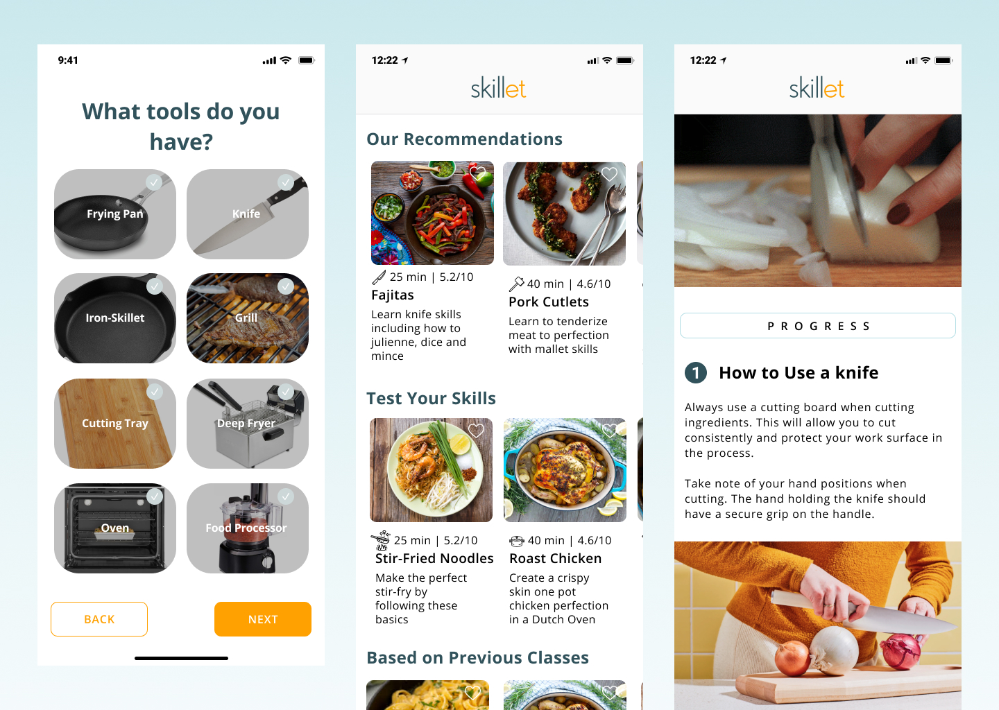Skillet is a cooking-skill app that guides users through curated lessons to improve technique and stay safe in the kitchen. With personalized goals and smart technology, it encourages people to learn, experiment, and discover joy in cooking.
